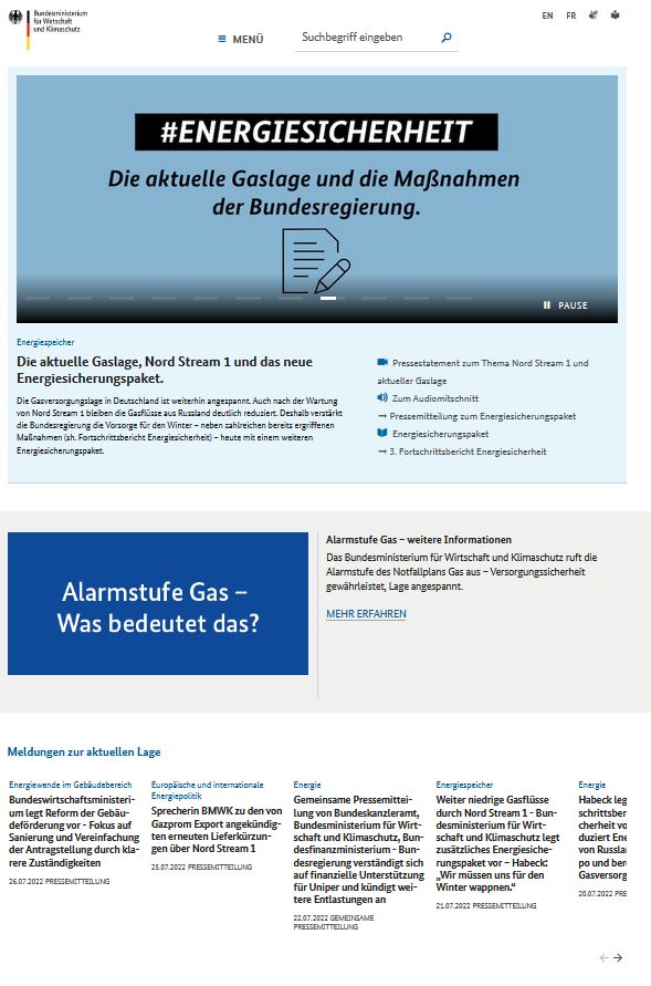 Auf ihrer Webseite informiert das Bundesministerium für Wirtschaft und Klimaschutz über die aktuelle Lage rund um das Thema Energiesicherung und Gasversorgung.