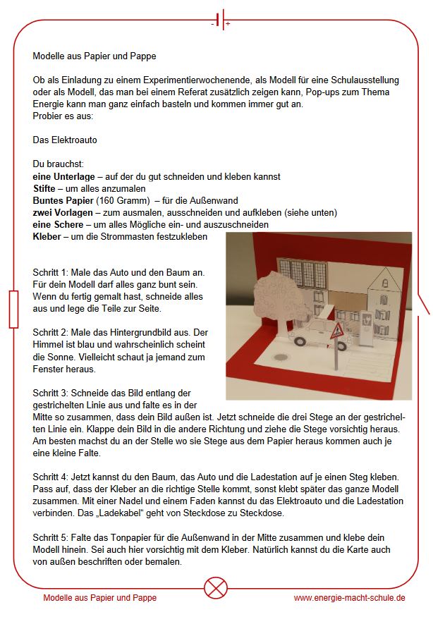 Diese Bastelanleitung dient Grundschülern als Vorlage für eine Pop-Up Karte, auf der sich ein Elektroauto mit Ladestation in der Stadt entfaltet.