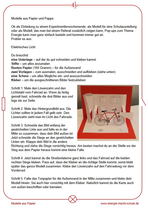 Mit dieser Bastelanleitung können Grundschüler eine Pop-Up Faltkarte basteln auf der ein Fahrrad mit Dynamo abgebildet ist.