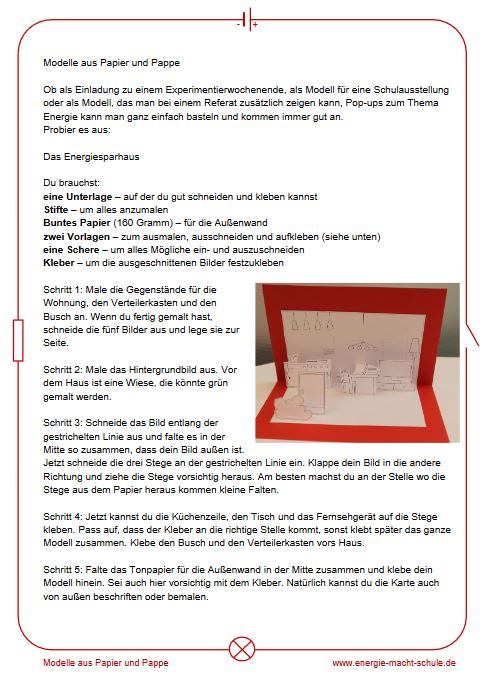 Anhand dieser Bastelanleitung können Grundschüler die verschiedenen Bestandteile, die ein Energiesparhaus ausmachen, anmalen, ausschneiden und zusammenkleben, sodass eine Pop-Up Faltkarte entsteht.
