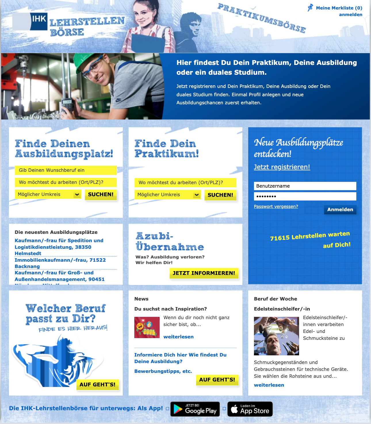 Internetplattform der Industrie- und Handelskammern (IHK) zu Angebot und Nachfrage auf dem Ausbildungsmarkt für Lehrberufe in Handel, Industrie und Dienstleistungseinrichtungen. Darüber hinaus bietet sie Unterstützung bei der Suche nach einem geeigneten Beruf anhand der Analyse persönlicher Stärken und Fähigkeiten.