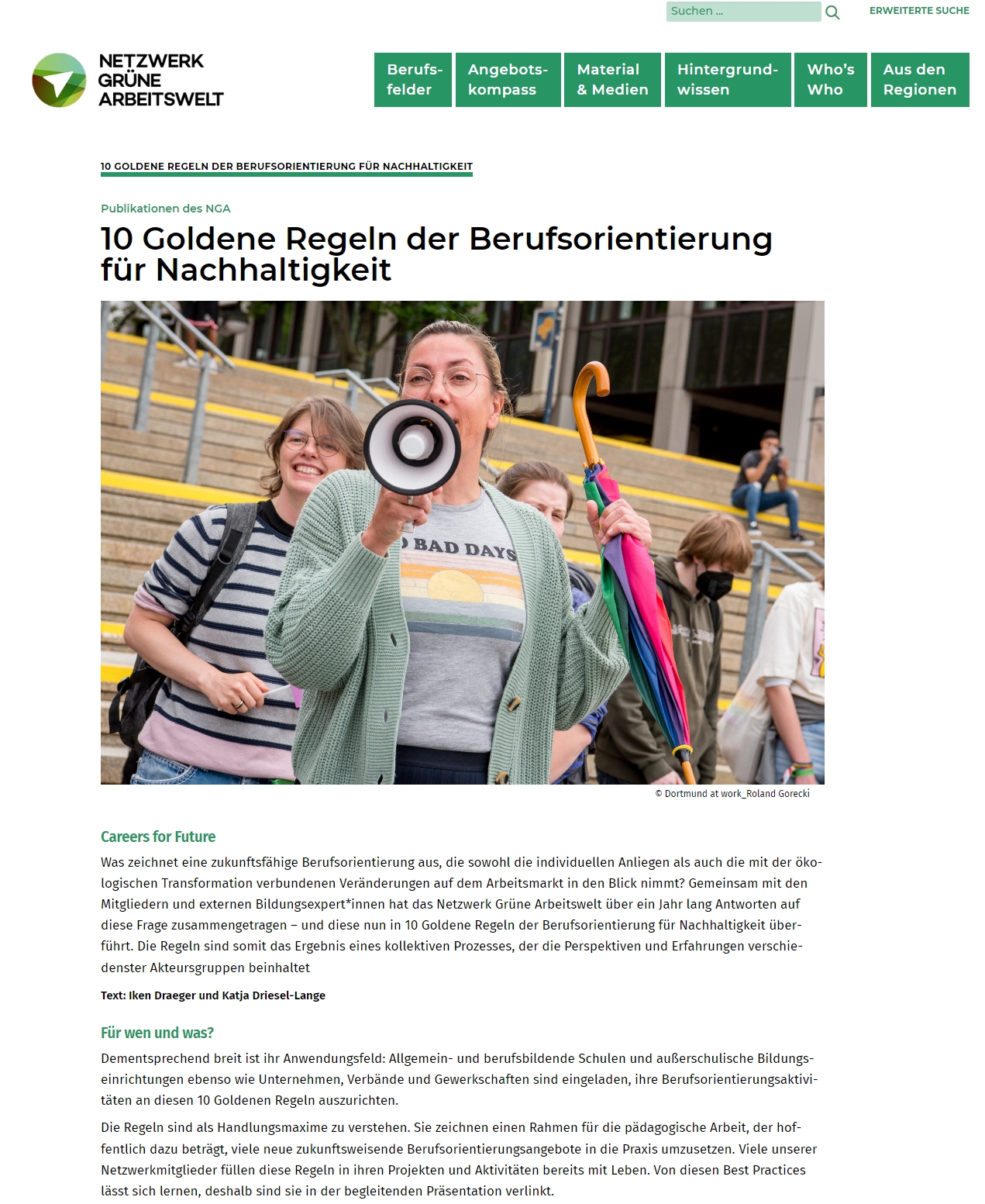 Authentizität, Praxiserfahrungen, positive Zukunftsbilder. Wie sollen wir der ökologischen Trans-formation des Arbeitsmarkts Rechnung tragen? Antwort geben die 10 Goldenen Regeln für eine zukunftsgerichtete Berufsorientierungsarbeit des Netzwerk Grüne Arbeitswelt.