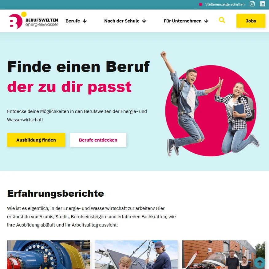 Ob Studium oder Ausbildung, das Portal informiert umfassend über die verschiedenen Einstiegsmöglichkeiten in Energie- und Wasserbranche. Passend dazu findet man Stellenangebote, Messetermine und Unternehmensprofile. Außerdem werden Tipps zur Bewerbung gegeben.