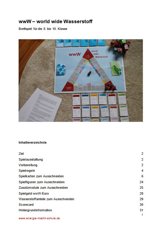 Mit dem Spiel „wwW – word wide Wasserstoff“ setzen sich die Schülerinnen und Schüler mit der Bedeutung von Wasserstoff in der Energieversorgung auseinander. Dabei lernen sie auch die Merkmale von grünem, grauen blauen und türkisen Wasserstoff kennen.