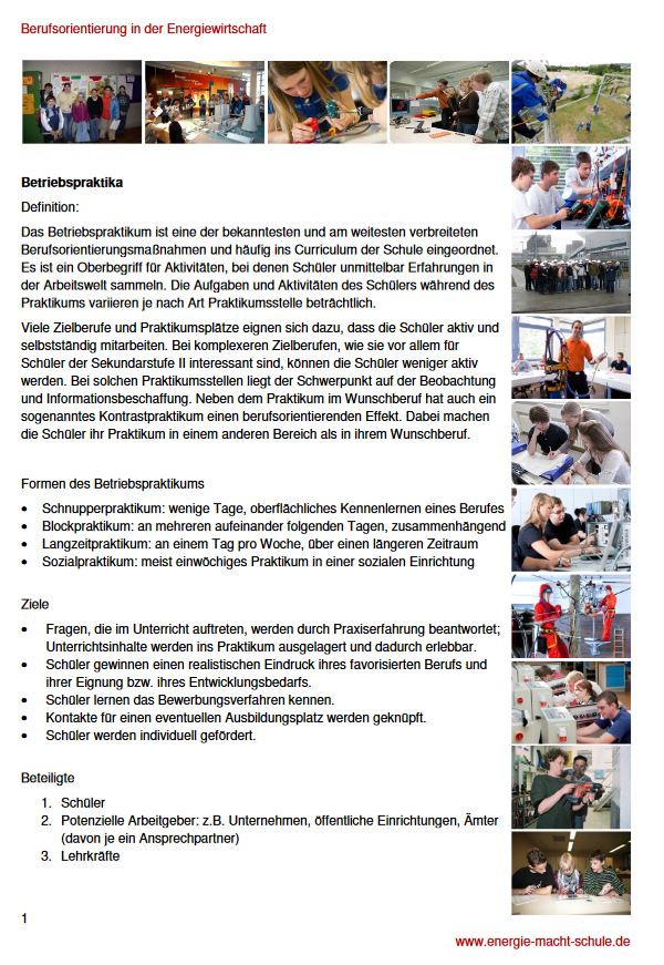 Das Betriebspraktikum ist eine der bekanntesten und am weitesten verbreiteten Berufsorientierungsmaßnahmen und häufig ins Curriculum der Schule eingeordnet. Es ist ein Oberbegriff für Aktivitäten, bei denen Schüler unmittelbar Erfahrungen in der Arbeitswelt sammeln. Die Aufgaben und Aktivitäten des Schülers während des Praktikums variieren je nach Art Praktikumsstelle beträchtlich. Das Arbeitsblatt stellt die Formen und Ziele von Betriebspraktika vor. Neben der Frage des Ablaufes werden dabei auch die Aspekte Betreuung sowie Vor- und Nachbereitung im schulischen Kontext angerissen.