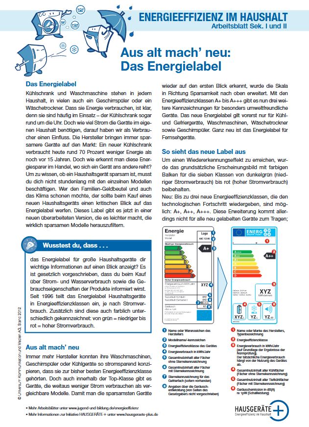 Mithilfe dieses Arbeitsblattes der Fachgemeinschaft für effizienten Energieanwendung e.V. (HEA) erhalten Schülerinnen und Schüler der Sekundarstufen I und II Informationen und Hintergründe zur neuen Energieverbrauchskennzeichnung und zum energiebewussten Umgang mit Haushaltsgeräten. Die Lernenden erfahren so die wichtigsten Neuerungen bezüglich der Energiekennzeichnung im Vergleich zum bisherigen Label und erhalten praktische Tipps im Umgang mit den energieeffizienten Geräten. Das Arbeitsblatt ist für alle naturwissenschaftlichen und wirtschaftlichen Fächer geeignet.
