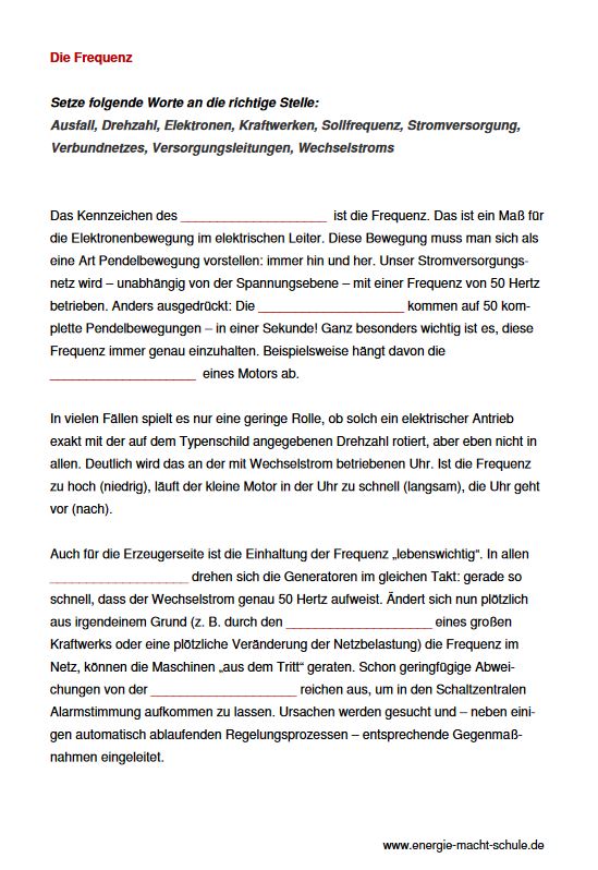 Anhand eines Lückentextes lernen die Schüler den Begriff „Frequenz“ kennen. Dabei erfahren sie auch, dass eine konstante Frequenz auf Erzeugerseite für die Versorgungssicherheit wichtig ist. Das Arbeitsblatt eignet sich insbesondere für den Einsatz im naturwissenschaftlichen und technischen Unterricht der Sekundarstufe I.