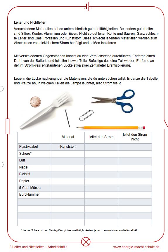 Welche Materialien können Strom leiten? Wie nennt man solche Materialien? Wie werden die den Strom nicht-leitenden Materialien bezeichnet? Mithilfe des Arbeitsblattes testen die Schüler die Leitfähigkeiten verschiedener Materialien des Alltags und protokollieren ihre Ergebnisse. Die Materialien sind Teil der Materialsammlung für die Klassenstufen 3 bis 5 zum Thema Strom.