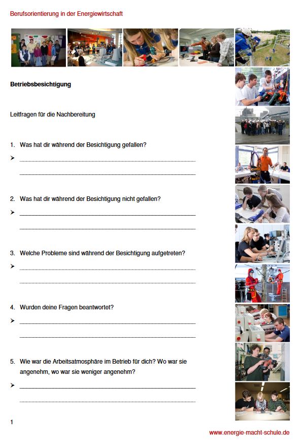 Das zweiseitige Arbeitsblatt, welches sich besonders für den Einsatz in der Sekundarstufe I eignet, fasst Leitfragen zur Reflexion eines Kraftwerksbesuchs zusammen. Es soll Schülerinnen und Schüler vor allem dabei helfen, das Gesehene und Erlebte gedanklich zu systematisieren, zu verbalisieren sowie gegebenenfalls offene und weitere Fragen zu formulieren.
