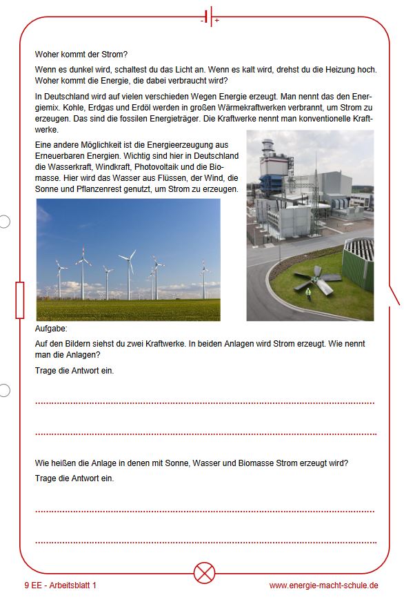 Welche Merkmale, Vor- und Nachteile hat die Energiegewinnung aus Wind- oder Sonnenenergie, Wasserkraft oder Biomasse? Wie funktioniert eine Windkraftanlage? Warum dreht sich ein Windrad? Ist Wind immer gleich Wind? Antworten auf diese und weitere Fragen liefert das vorliegende Arbeitsblatt. Dafür stehen Informations- und Lückentexte, Experimentieranleitungen, Kreuzworträtsel und Schaubilder bereit. Die Materialien sind Teil des Portfolios für die Klassenstufen 3 bis 5 zum Thema Strom.