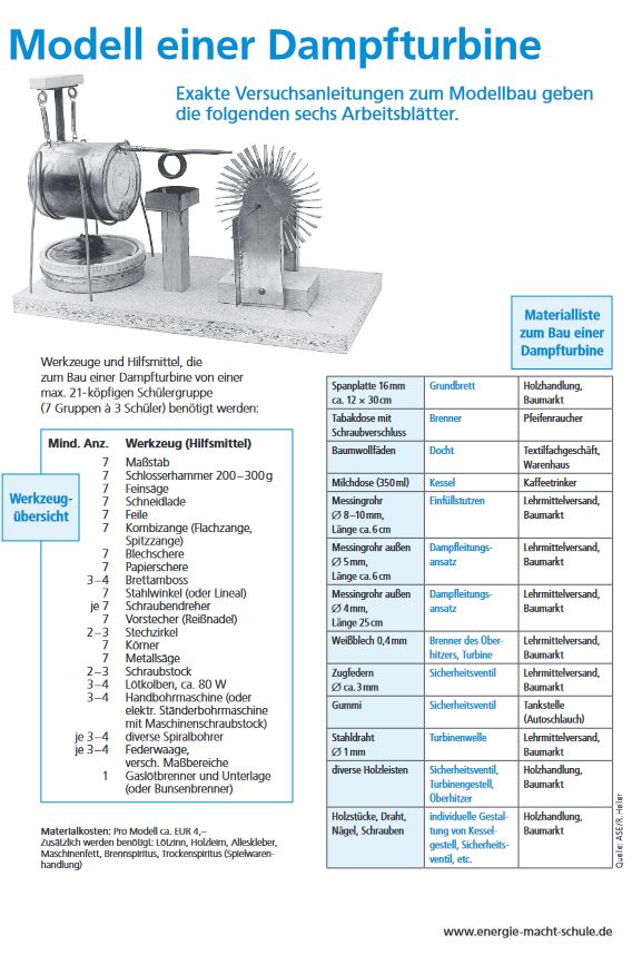 In einem gemeinschaftlichen Bauprojekt planen und konstruieren Schüler eine Dampfturbine. Das Projekt dient als niedrigschwelliger Einstieg in die Themen Energie und Energieerzeugung. Einsatzmöglichkeiten bieten sich insbesondere in der Sekundarstufe I. Dort kann es im Technikunterricht oder Werkunterricht genutzt werden.