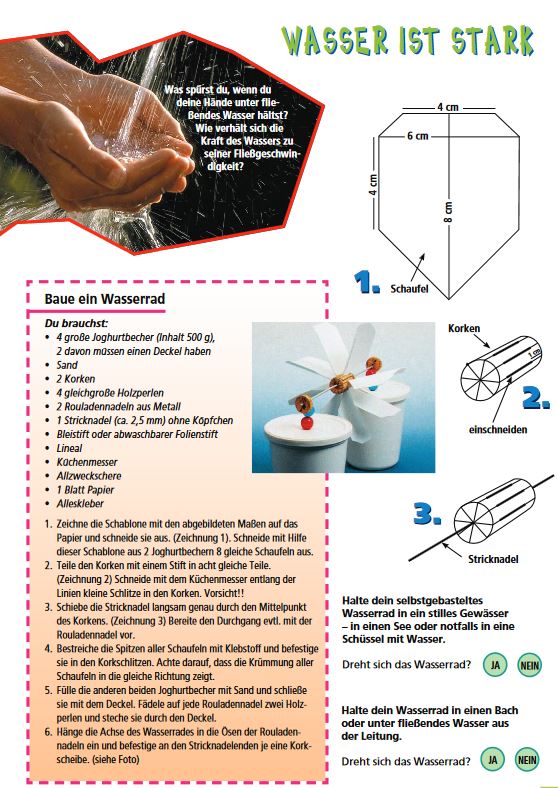 Zum Verständnis der Wasserkraft sind die Schüler dazu angehalten, mithilfe der Bastelanleitung ihr eigenes Wasserrad zu bauen und in einem fließenden sowie einem stehenden Gewässer zu testen. Einsatzmöglichkeiten bieten die Fächer Sachkunde, Technik oder Werken in der Grundschule.