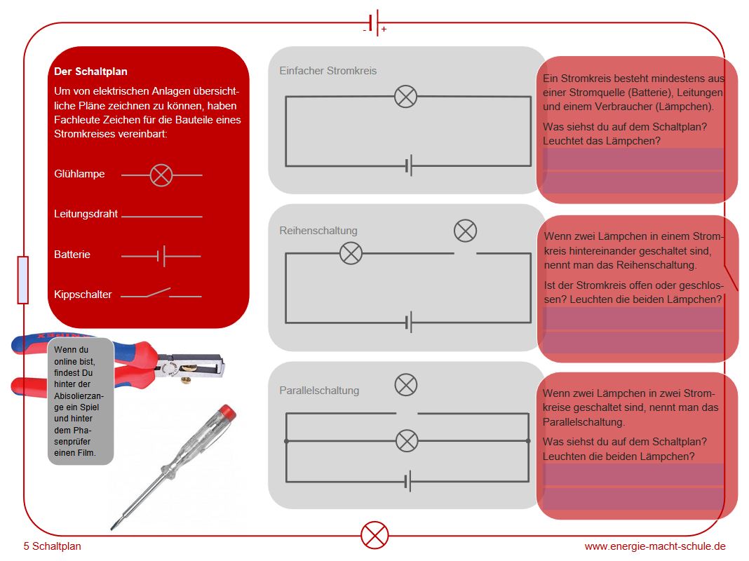 Anhand des Arbeitsblattes lernen die Schülerinnen und Schüler vier grundlegende Zeichen, die in Schaltplänen verwendet, werden kennen. Die Schüler setzen sich zudem mit dem Aufbau eines einfachen Stromkreises, einer Reihenschaltung und einer Parallelschaltung auseinander. Die entsprechenden Schaltpläne sind auf dem Arbeitsblatt abgebildet. Zu jedem Schaltplan überlegen sich die Schüler, ob die in den Stromkreis eingebauten Lämpchen leuchten.