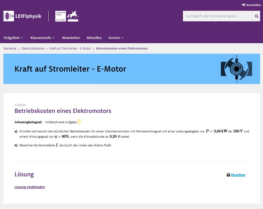 Auf Leif-Physik der Joachim Hertz Stiftung können Lernende die stündlichen Betriebskosten für einen Gleichstrommotor mit Permanentmagnet ausrechnen. Zur Überprüfung steht eine Lösung bereit.