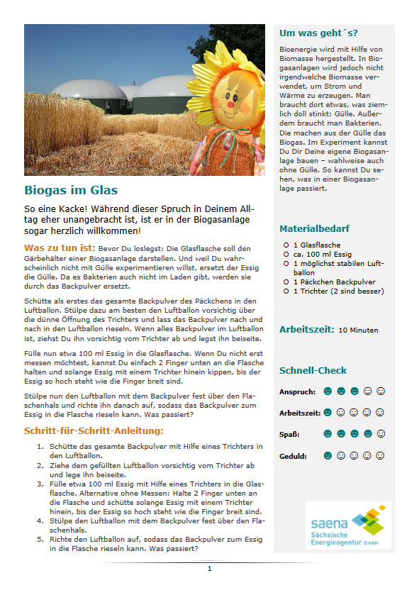 Bioenergie wird mit Hilfe von Biomasse hergestellt. Biogasanlagen nutzen jedoch nicht irgendwelche Biomasse, um Strom und Wärme zu erzeugen. Man braucht dort etwas, was ziemlich stinkt: Gülle. Außerdem braucht man Bakterien. Die machen aus der Gülle das Biogas. Im Experiment der Landesenergieagentur Sachsen können Lernende selbst ihre eigene Biogasanlage bauen – und zwar mit Essig und Backpulver. So können sie sehen, was in einer Biogasanlage passiert. Das Experiment eignet sich für den Sachkundeunterricht in der Grundschule sowie im naturwissenschaftlichen Unterricht der frühen Sekundarstufe I.