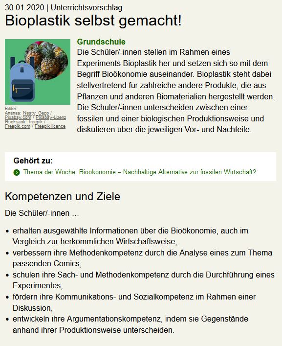 Die Leitfragen für die Unterrichtseinheit lauten: Was ist der Unterschied zwischen Plastik und Bioplastik? Wie können Biomaterialien helfen, umweltfreundliche Produkte herzustellen? Die Materialien zur Durchführung des Experiments können auf der Internetseite des Bundesministeriums für Umwelt, Naturschutz und nukleare Sicherheit kostenlos heruntergeladen werden.