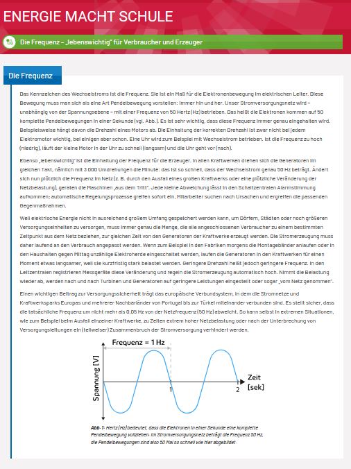 Anhand der interaktiven Lernanwendung wird der Begriff der Frequenz mit Hilfe von Schaubildern und Arbeitsblättern erklärt. Daraus erfahren Schüler wichtige Informationen über Frequenzen und ihre Bedeutung sowie ihren Betrag zur Versorgungssicherheit im europäischen Verbundsystem.