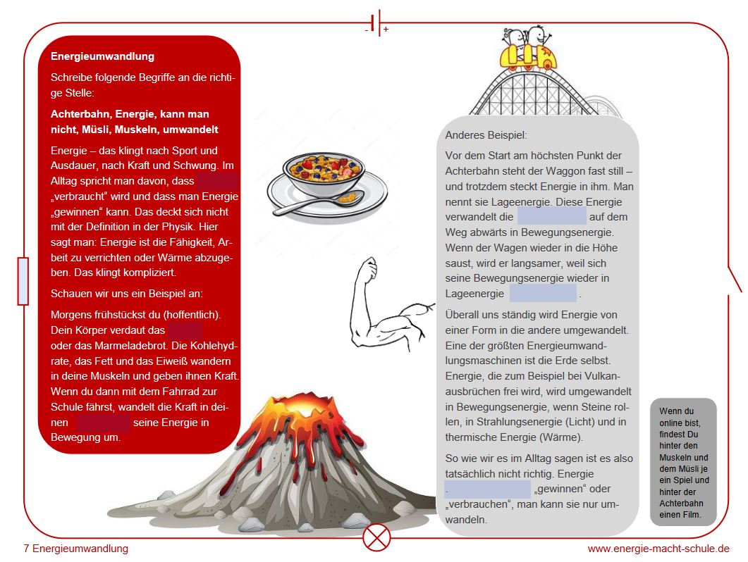 Das Arbeitsblatt thematisiert die Energieumwandlung. Die Schüler füllen einen Lückentext aus, in dem die Umwandlung von Energie anhand von Beispielen anschaulich erläutert wird. Der alltäglichen Verwendung des Begriffs „Energie“ wird eine physikalische Definition gegenübergestellt. Es wird deutlich, dass man Energie nicht „gewinnen“ oder „verbrauchen“, sondern nur umwandeln kann. Ergänzend sind ein Film und ein Spiel mit dem Arbeitsblatt verlinkt.