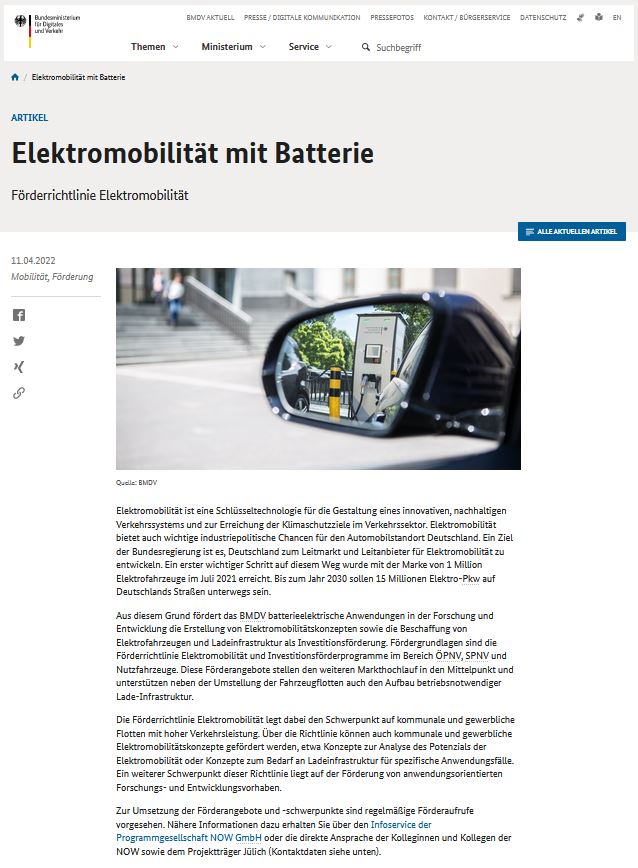 Die Webseite bietet unter anderem umfassende Informationen zur Mobilität und Elektromobilität und stellt die Aktivitäten der Bundesregierung vor. Darüber hinaus informiert es über Modellregionen und das Innovationsprogramm Wasserstoff und Brennstoffzellentechnologie (NIP).
