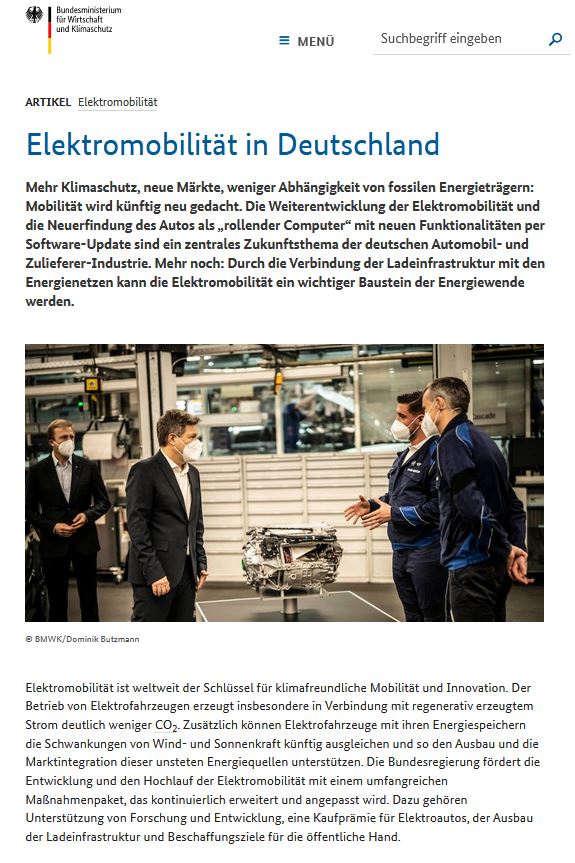 Auf der Webseite des Bundesministeriums für Wirtschaft und Klimaschutz finden Sie einen Artikel mit umfassenden Informationen zum Thema Elektromobilität. Dabei sind auch gesetzliche Rahmenbedingungen und Anreizsysteme für die Verbraucher Thema.