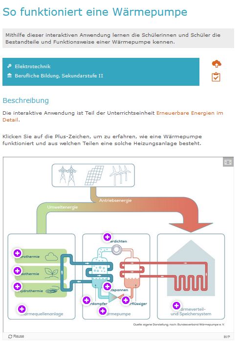 Mithilfe dieser interaktiven Anwendung von Lehrer-Online lernen die Schülerinnen und Schüler die Bestandteile und Funktionsweise einer Wärmepumpe kennen.