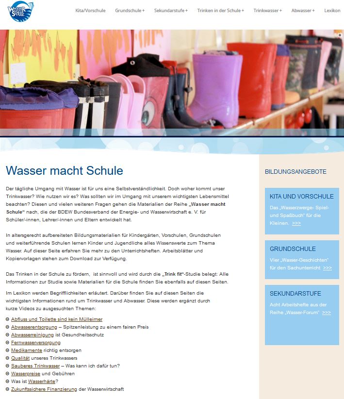 Auf Wasser-macht-Schule hat der BDEW Bundesverband der Energie- und Wasserwirtschaft e.V. alle relevanten Informationen zum Thema Wasser übersichtlich und unterrichtsgerecht aufbereitet, um umfassend über dieses wertvolle und lebenswichtige Gut zu informieren.