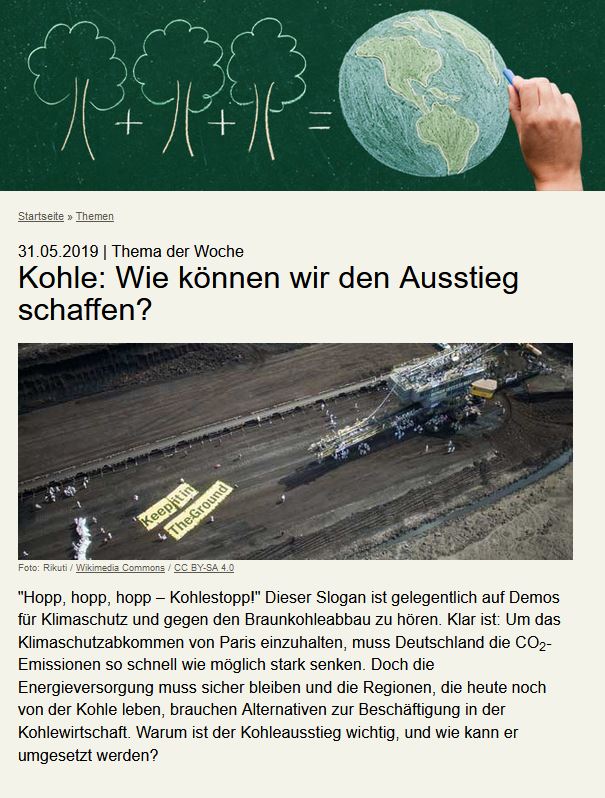 Im Mittelpunkt der Unterrichtsvorschläge steht der sogenannte Kohleausstieg in Deutschland – die Beendigung der Nutzung von Kohle als Energieträger. Es geht um die Fragen, warum der Ausstieg vor dem Hintergrund des Klimawandels notwendig ist und wie er umgesetzt werden kann. Ziel ist, ein allgemeines Verständnis für die Bedeutung und den Unterschied von Energieträgern zu vermitteln. Dabei wird zudem ein Bezug zur Lebenswelt der Schülerinnen und Schüler hergestellt. Im Sinne des Nachhaltigkeitsprinzips werden neben Aspekten des Umwelt- beziehungsweise Klimaschutzes auch ökonomische und soziale Aspekte betrachtet. Zum Beispiel werden Strukturveränderungen in Kohleregionen thematisiert. Das Unterrichtsmaterial des Bundesministeriums für Umwelt, Naturschutz, nukleare Sicherheit und Verbraucherschutz befasst sich mit diesem Thema. Es bietet Materialien für die Grundschule sowie die Sekundarstufe I und stellt für Lehrkräfte zusätzlich Hintergrundinformationen bereit.