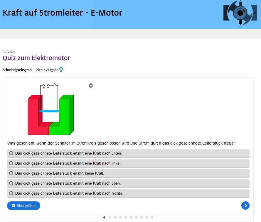 Was geschieht in einem Elektromotor, wenn der Stromkreis geschlossen wird? Welche Aufgabe hat der Kommutator? Wie kann man die Drehrichtung eines Elektromotors umkehren? Mit dem Quiz von Leif-Physik der Joachim Hertz-Stiftung kann man dazu sein Wissen testen.