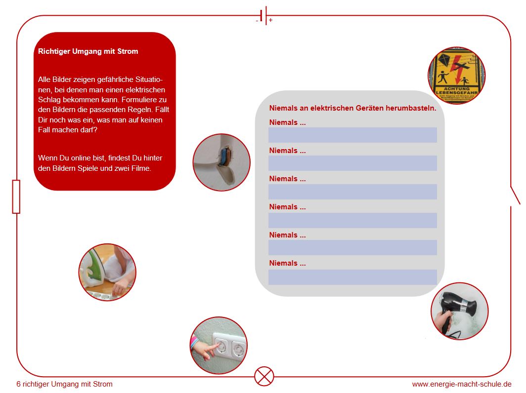 Die Schülerinnen und Schüler stellen auf dem Arbeitsblatt Regeln für den richtigen Umgang mit Strom auf. Den Impuls für die Formulierung der Regeln stellen Bilder dar, auf denen jeweils eine gefährliche Situation dargestellt wurde, bei der man einen Stromschlag bekommen kann. Die in Bezug auf diese Bilder formulierten Regeln für den richtigen Umgang mit Strom werden auf dem interaktiven Arbeitsblatt festgehalten. Zudem finden sich ergänzend hinter den einzelnen Bildern Spiele und zwei Filme verlinkt.