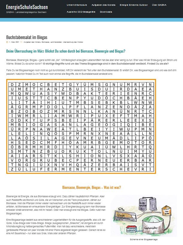 Biomasse, Bioenergie, Biogas – ganz schön viel „bio“. Mit ökologisch erzeugten Lebensmitteln hat das aber eher wenig zu tun. Eher was mit der Erzeugung von Strom und Wärme. 18 wichtige Begriffe rund um das Thema Biogasanlage sind in dem Buchstabensalat der Landesenergieagentur versteckt. Wer kann Sie alle finden. Das Spiel eignet sich als niederschwelliger Einstieg in das Thema Bioenergie kann aber auch als Wiederholung zur Überprüfung zuvor erlangten Wissens genutzt werden. Einsatzmöglichkeiten bieten besonders die Klassenstufen 4 bis 6. Das Material kann als PDF heruntergeladen werden. Darüber hinaus steht ein Lösungsblatt bereit.