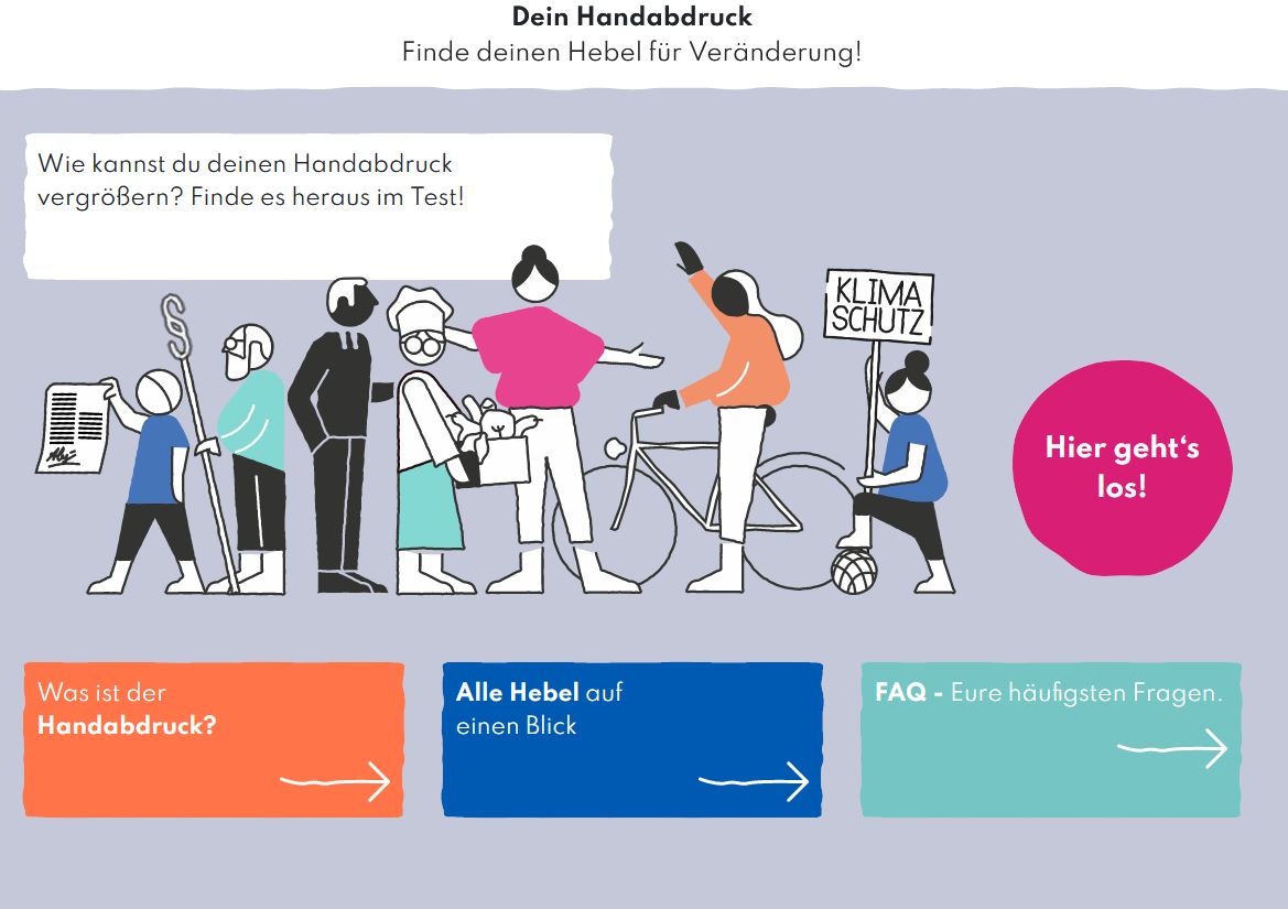 Test von „Brot für die Welt“ und Germanwatch, der Interessierten und Engagierten hilft, herauszufinden, wie sie ihren Handabdruck für eine sozial und ökologisch gerechte Gesellschaft vergrößern können.