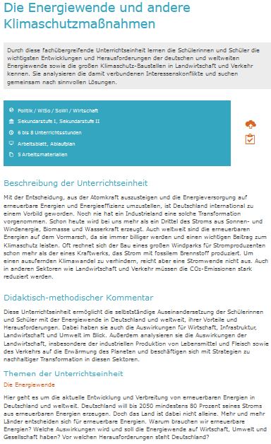 Durch diese fachübergreifende Unterrichtseinheit lernen die Schülerinnen und Schüler die wichtigsten Entwicklungen und Herausforderungen der deutschen und weltweiten Energiewende sowie die großen Klimaschutz-Baustellen in Landwirtschaft und Verkehr kennen. Sie analysieren die damit verbundenen Interessenskonflikte und suchen gemeinsam nach sinnvollen Lösungen.