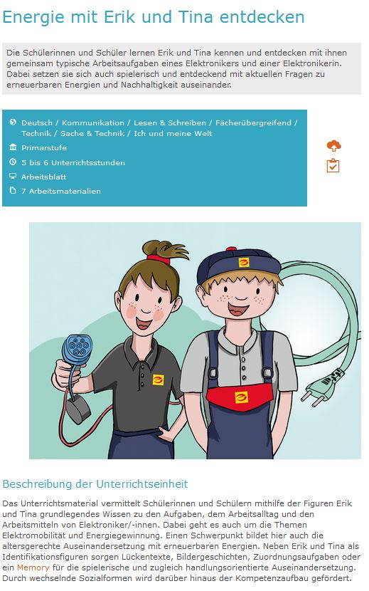 Die Schülerinnen und Schüler lernen Erik und Tina kennen und entdecken mit ihnen gemeinsam typische Arbeitsaufgaben eines Elektronikers und einer Elektronikerin. Dabei setzen sie sich auch spielerisch und entdeckend mit aktuellen Fragen zu erneuerbaren Energien und Nachhaltigkeit auseinander. Die Unterrichtseinheit, welche auf Lehrer-Online verfügbar ist, eignet sich besonders für den Einsatz in der Grundschule, insbesondere im Sachkundeunterricht der Klassenstufen 3 und 4.