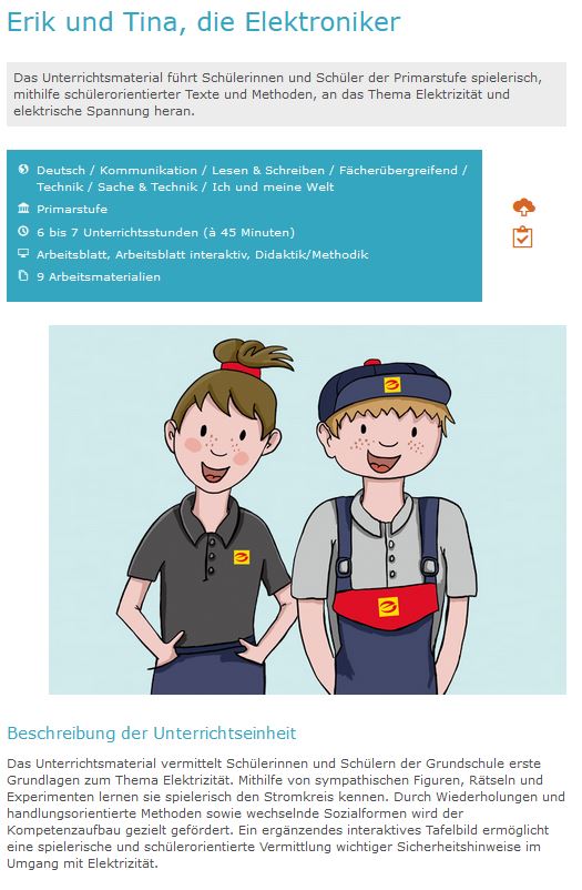 Das Unterrichtsmaterial „Erik und Tina, die Elektroniker“ richtet sich an Schülerinnen und Schüler der Grundschule, insbesondere an die Klassenstufen 3 und 4. Die Kinder sollen mithilfe der beiden sympathischen Figuren spielerisch an Themen rund um die Elektrizität herangeführt werden. Verschiedene didaktische Angebote, wie Rätsel und Experimente, Spiele oder Bilder, ermöglichen den Schülerinnen und Schülern einen abwechslungsreichen und anregenden Einstieg in diesen Themenkomplex. Das Material kann sowohl in Gruppen als auch in Einzelarbeit, zum Beispiel als Zusatzaufgabe, von der Lehrkraft angeboten werden. Es ist auf Lehrer-Online kostenfrei verfügbar.
