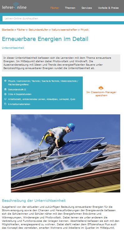 Die Unterrichtseinheit von Lehrer-Online sowie „Handwerk macht Schule“ ermöglicht Schülerinnen und Schülern einen fächerübergreifenden Zugang zum Thema erneuerbare Energien. Dazu erschließen sie in einem ersten Schritt die verschiedenen erneuerbaren Energieträger mit ihren Merkmalen und Funktionsweisen. Dabei reflektieren sie auch die mit der Energiewende verbundenen Chancen und Herausforderungen. Darauf aufbauend lernen sie den Aufbau und die Funktionsweise einer Windkraftanlage und einer Photovoltaikanlage näher kennen. Gleichzeitig lernen sie aktuelle Entwicklungen wie den Solarstromspeicher kennen. Abschließend setzen sie sich mit Möglichkeiten energiesparenden Wohnens und Arbeitens unter der Nutzung erneuerbarer Energien auseinander. Dabei geht es neben der Funktionsweise um neue Konzepte wie das des vernetzten, smarten Wohnens und Arbeitens im Quartier. Ein interaktives Multiple-Choice-Quiz dient der Wiederholung und Festigung des in dieser Unterrichtseinheit erlangten Wissens.