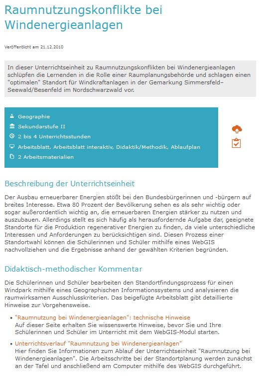 Aufgabe der Raumplanungsbehörden ist es, im Raumnutzungskonflikt abzuwägen und „optimale“ Standorte für Windkraftanlagen zu finden. In die Rolle einer solchen Planungsbehörde schlüpfen die Schülerinnen und Schüler und schlagen einen Standort für die Gemarkung Simmersfeld-Seewald/Besenfeld im Nordschwarzwald vor. Einsatzmöglichkeiten der Lehrer-Online verfügbaren Unterrichtseinheit der auf bieten die Fächer Geografie sowie Naturwissenschaft und Technik in der Sekundarstufe II.
