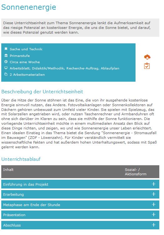 Photovoltaikanlagen oder Sonnenkollektoren auf Dächern gehören unbewusst zum Umfeld vieler Kinder. Sie spielen mit Spielzeug, das mit Solarzellen angetrieben wird, oder nutzen Taschenrechner und Armbanduhren oft ohne sich darüber im Klaren zu sein, dass sie mithilfe der Sonne funktionieren. Die auf Lehrer-Online verfügbare Unterrichtseinheit möchte in einem multimedialen Ansatz den Blick auf diese Dinge richten, und zeigen, wo und wie Sonnenenergie unser Leben erleichtert. Einen idealen Einstieg in das Thema bietet die Sendung „Sonnenenergie – Stromausfall im Bauwagen“ (ZDF – Löwenzahn). Für Kinder verständlich vermittelt sie wissenschaftliche Fakten und hat außerdem hohen Unterhaltungswert, sodass mit Spaß gelernt werden kann.