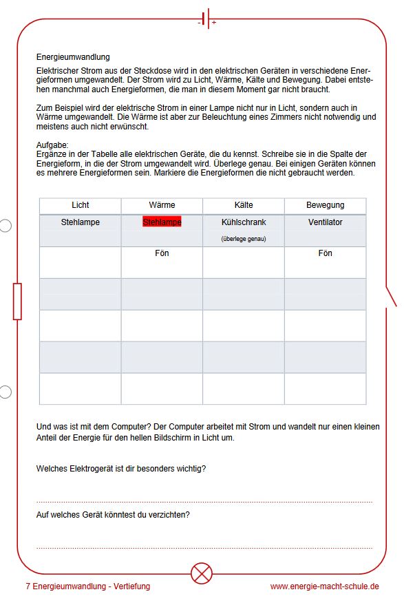 Am Beispiel verschiedener elektrischer Geräte lernen die Schülerinnen und Schüler verschiedene Energieformen kennen, in die der Strom umgewandelt wird. Einsatzmöglichkeiten bietet das Arbeitsblatt im Sachkundeunterricht in der Sekundarstufe I. Das vertiefende Arbeitsblatt ist Teil des Arbeitsblatt-Portfolios „Energieumwandlung“. Es kann somit in Kombination mit den dort hinterlegten grundlegenden Materialien als auch unabhängig davon eingesetzt werden.