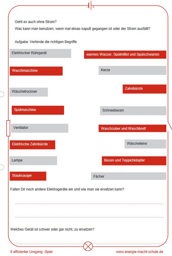 Welche Gegenstände kann man benutzen, wenn einmal der Strom ausfällt? Was sind die Alternativen? Anhand des Arbeitsblattes, welches für den Sachkundeunterricht der Grundschule geeignet ist, setzen sich die Schülerinnen und Schüler mit diesen Fragen auseinander. Dabei verbinden sie das entsprechende technische Gerät mit dem adäquaten Gegenstand, welches für die Erledigung der Aufgabe keinen Strom benötigt. Sie werden so für das Thema sparsamer und effizienter Umgang mit Energie sensibilisiert und lernen, dass nicht überall technische Geräte zum Einsatz kommen müssen. Für Lehrkräfte steht ein Lösungsblatt bereit. Das vertiefende Arbeitsblatt ist Teil des Arbeitsblatt-Portfolios „effizienter Umgang“. Es kann somit in Kombination mit den dort hinterlegten grundlegenden Materialien als auch unabhängig davon eingesetzt werden.