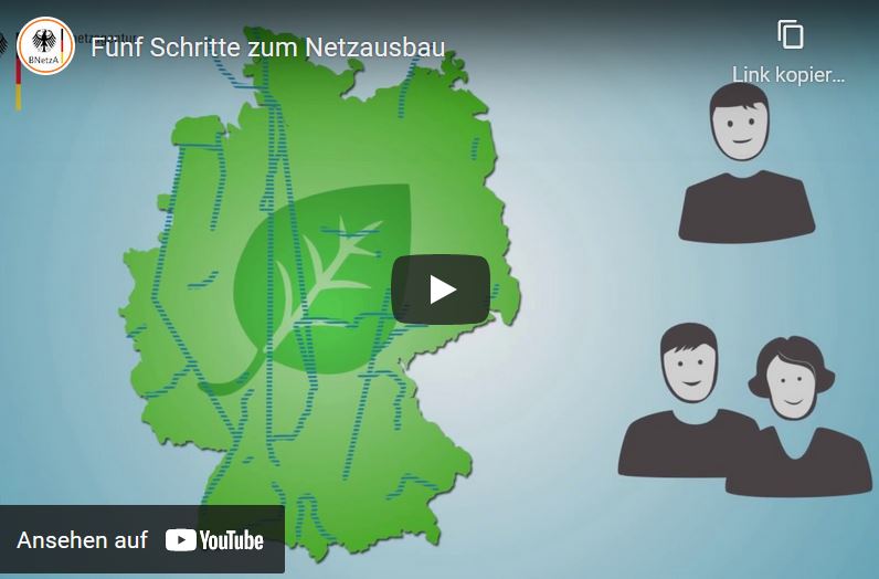 Der Animationsfilm der Bundesnetzagentur erklärt die fünf Schritte zum Netzausbau und zeigt, wie sich Bürgerinnen und Bürger beteiligen können. Der Beitrag kann in den Sekundarstufe I und II vor allem in den Fächern Geografie, Sozialkunde oder Technik eingesetzt werden. Er sollte jedoch von der Lehrkraft immer in einen methodisch-didaktischen Kontext eingebunden werden. Dieser Beitrag und weitere Clips können auch auf der Webseite der Bundesnetzagentur eingesehen werden.