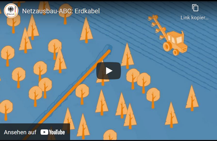Der Videoclip der Bundesnetzagentur erläutert in knapp einer Minute, wann Erdkabel eingesetzt werden und welche Vor- und Nachteile sie mit sich bringen. Der Beitrag kann vor allem in den naturwissenschaftlichen und technischen Fächern der Sekundarstufen I und II eingesetzt werden. Es ist jedoch stets von der Lehrkraft in einen methodisch-didaktischen Kontext einzubinden. Dieser Beitrag und weitere Clips können auch auf der Webseite der Bundesnetzagentur eingesehen werden.