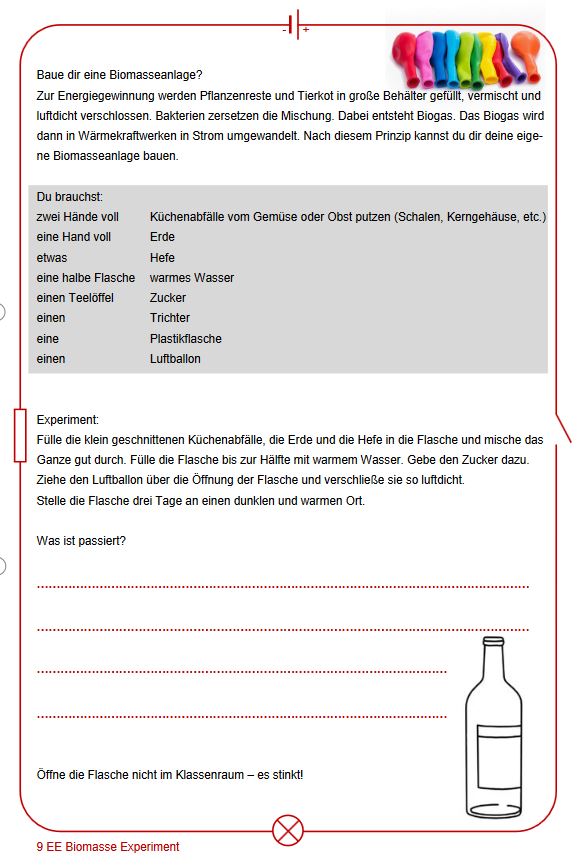 Anhand der Experimentieranleitung bauen die Schülerinnen und Schüler mit einfachen Hilfsmitteln aus Küchenabfällen eine eigene kleine Biogasanlage und protokollieren ihre Beobachtungen.
