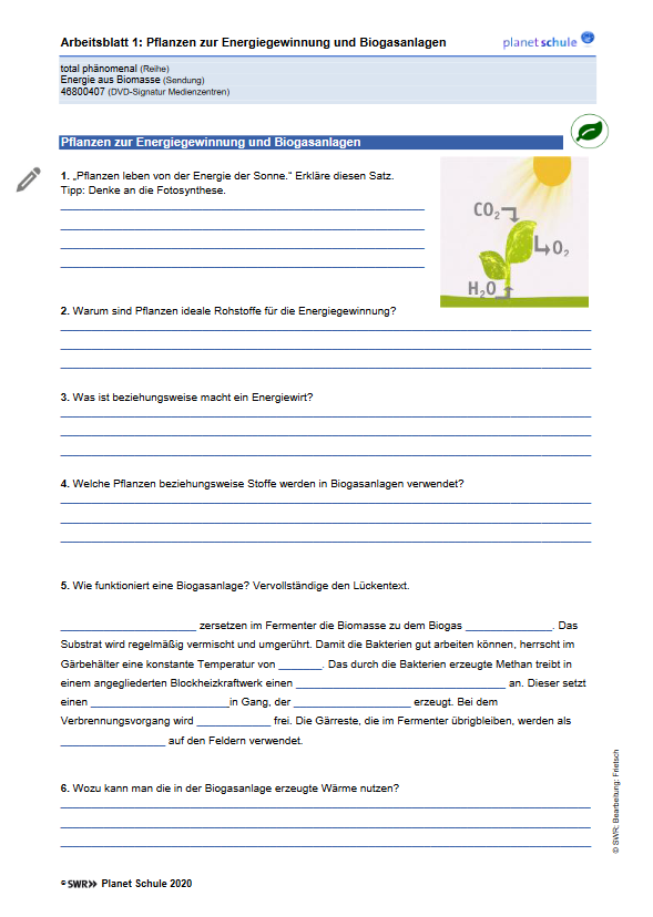 Arbeitsblatt: Pflanzen zur Energiegewinnung und Biogasanlagen