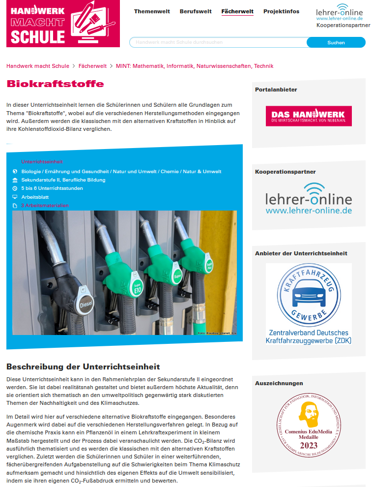Unterrichtseinheit: Biokraftstoffe – Handwerk macht Schule