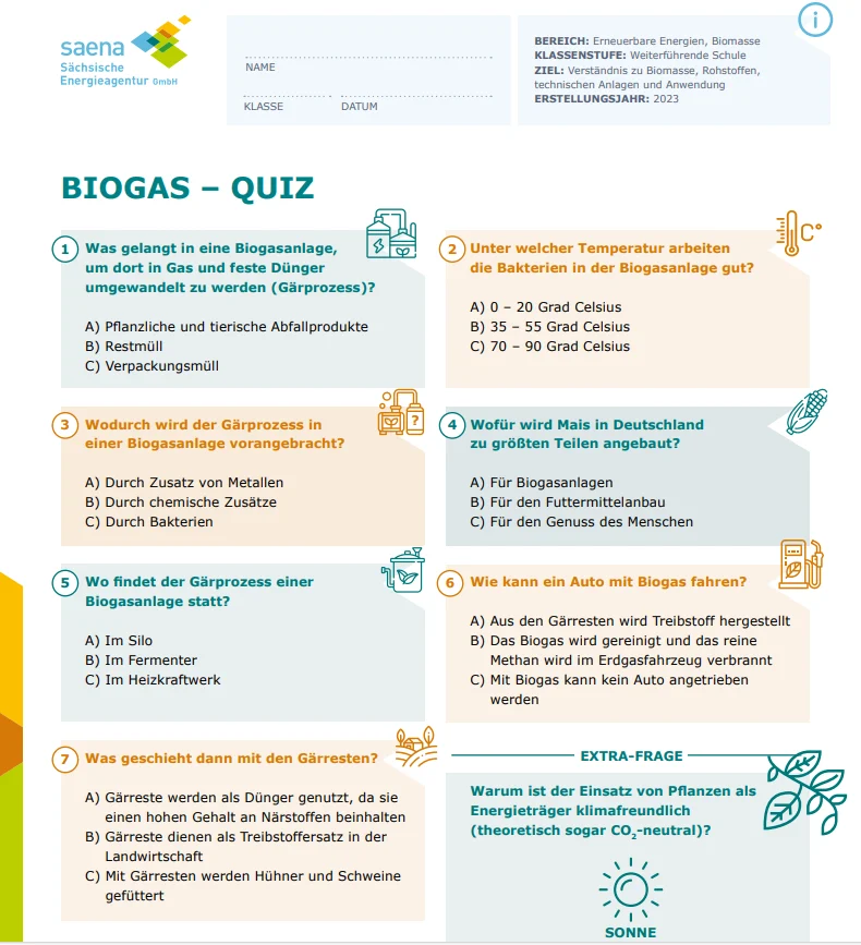 Die Sächsische Energieagentur SAENA hat Materialien zum Thema Biogas für die gymnasiale Oberstufe entwickelt, darunter ein Quiz und zwei Arbeitsblätter zur Umwandlung von Biomasse in Energie und den Biogasanlagen sowie den Biomasseheizkraftwerken.