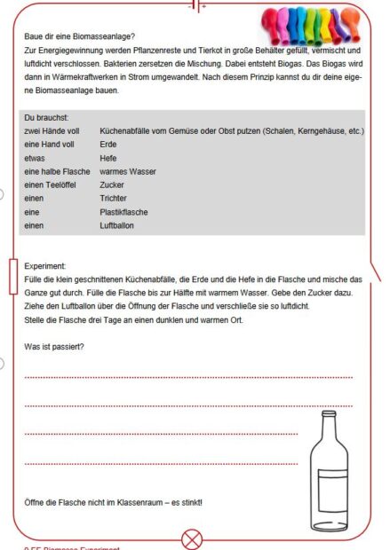 Anhand der Experimentieranleitung bauen die Schülerinnen und Schüler mit einfachen Hilfsmitteln aus Küchenabfällen eine eigene kleine Biogasanlage und protokollieren ihre Beobachtungen.