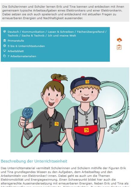 Die Schülerinnen und Schüler lernen Erik und Tina kennen und entdecken mit ihnen gemeinsam typische Arbeitsaufgaben eines Elektronikers und einer Elektronikerin. Dabei setzen sie sich auch spielerisch und entdeckend mit aktuellen Fragen zu erneuerbaren Energien und Nachhaltigkeit auseinander.