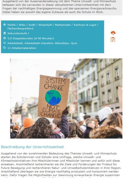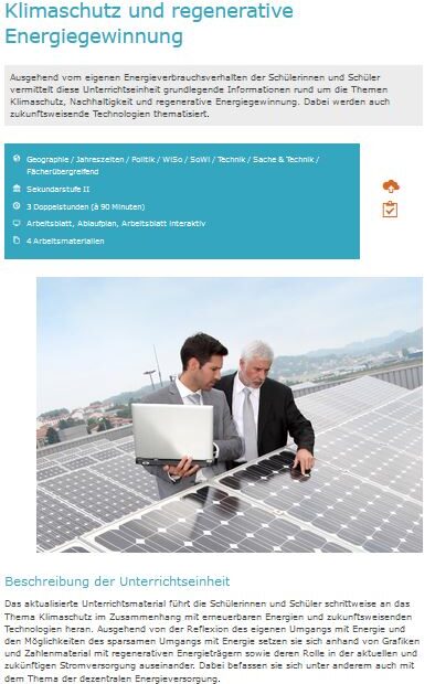 Die Unterrichtseinheit auf Lehrer-Online ermöglicht Schülerinnen und Schülern einen fächerübergreifenden Zugang zu den Themen Energieeffizienz, regenerative Energiegewinnung und Nachhaltigkeit.