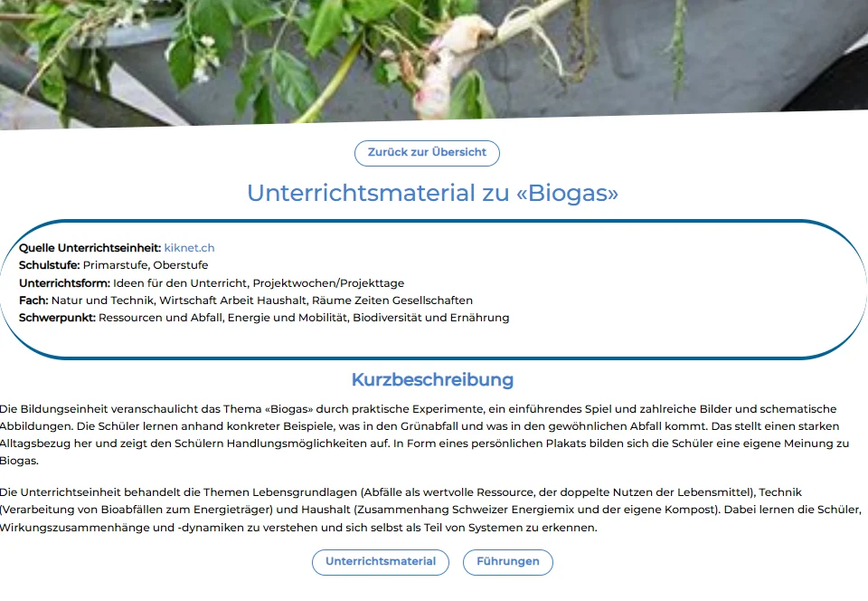 Die Bildungseinheit von „My Blue Planet/Klimaschulen“ veranschaulicht das Thema „Biogas“ durch praktische Experimente, ein einführendes Spiel und zahlreiche Bilder und schematische Abbildungen. Die Schüler lernen anhand konkreter Beispiele, was in den Grünabfall und was in den gewöhnlichen Abfall kommt.