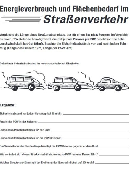 Anhand einer Rechenaufgabe sind die Schülerinnen und Schüler aufgefordert, den Energieverbrauch und den Flächenbedarf eines mit 80 Personen besetzen Busses mit dem eines PKWs zu vergleichen.